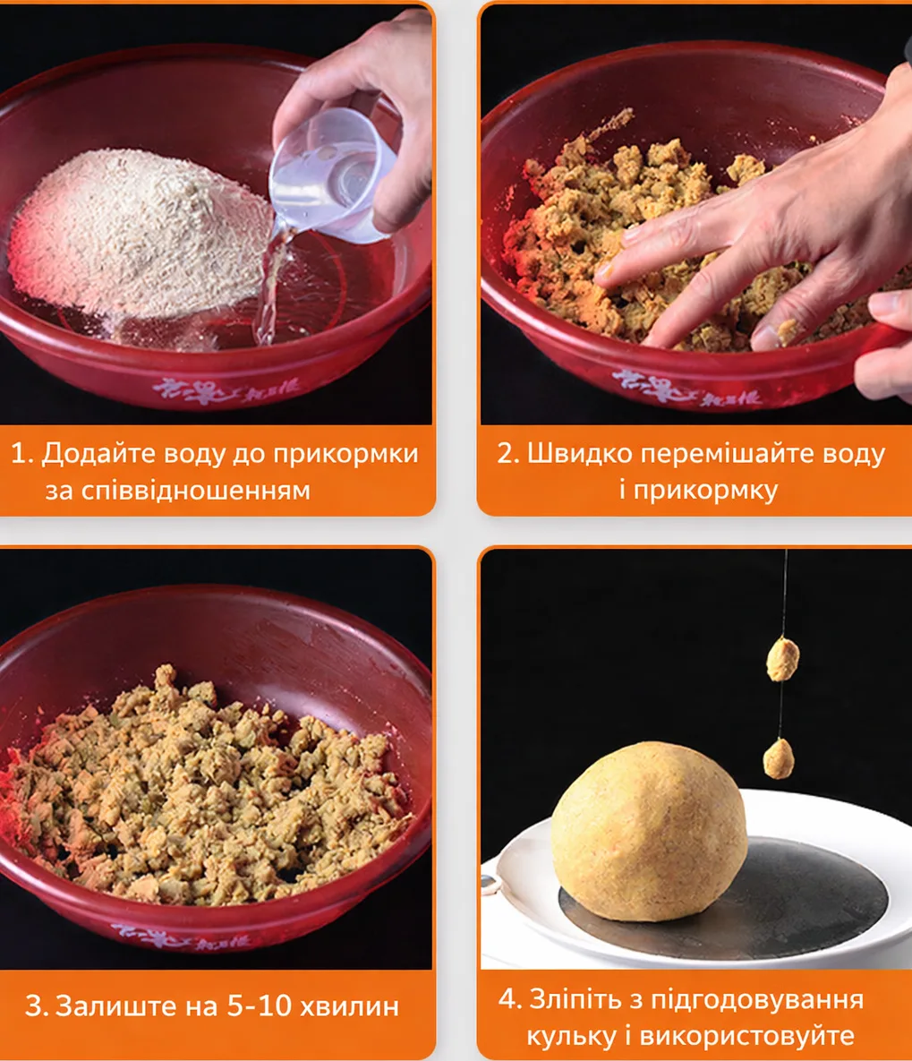 - Для кульок (щільніша подача): співвідношення вода/прикормка 1 : 1